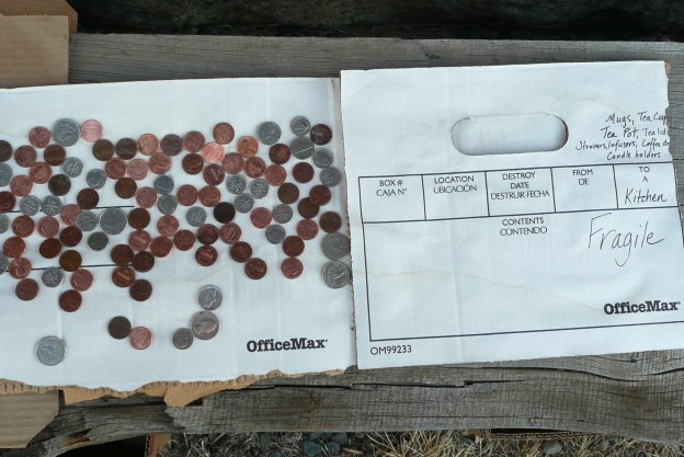 That change in the photo above was in the compartment under the driver’s armrest in my truck and a tube of Chapstik melted. Change became stuck. Can’t be stuck in change. Coincidentally, I laid it out to dry on remnants of OfficeMax box used in moving once twelve years ago, and four times in the last two years. That box has now changed into a coin-dryer and will become fire-starter. Soon, weather is changing.
